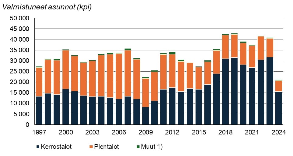 Uudisrakentamisen heikko vire jatkuu myös vuonna 2025. Aloitusmäärät romahtivat jo vuosina 2022–2023, ja rakentamisen kokonaisvolyymi on pysynyt poikkeuksellisen matalalla tasolla. Vaikka aiempien vuosien aloituksista valmistui vielä runsaasti asuntoja, nyt myös valmistumismäärät ovat kääntyneet selvään laskuun. Tilanne on erityisen vaikea uudisasuntorakentamisessa: vuoden 2024 aikana valmistuneiden asuntojen määrä jäi selvästi aiempaa alhaisemmaksi – etenkin kerrostalotuotanto on vähentynyt merkittävästi.